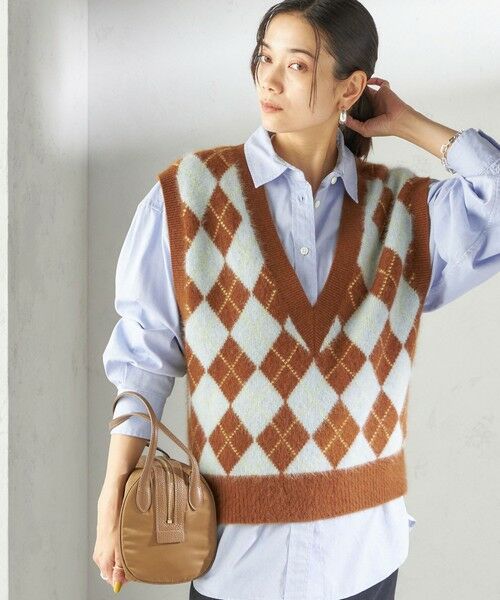 アーガイル柄のヘアリーな素材が特徴なディープVネックのニットベスト。