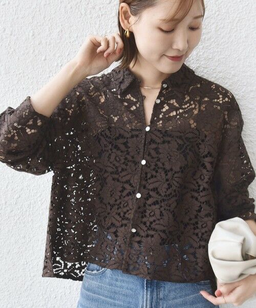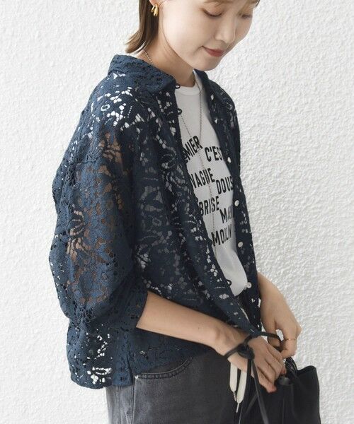 繊細なレースの透け感が楽しめる、シンプルなシャツカラーのレースブラウス。