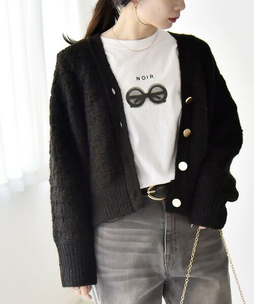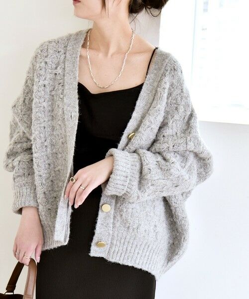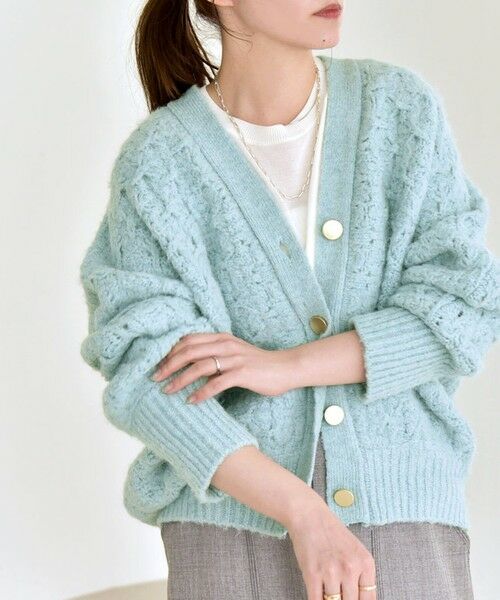 レース編みのような柔らかく立体感のある編地が特徴のニットカーディガン。