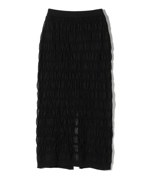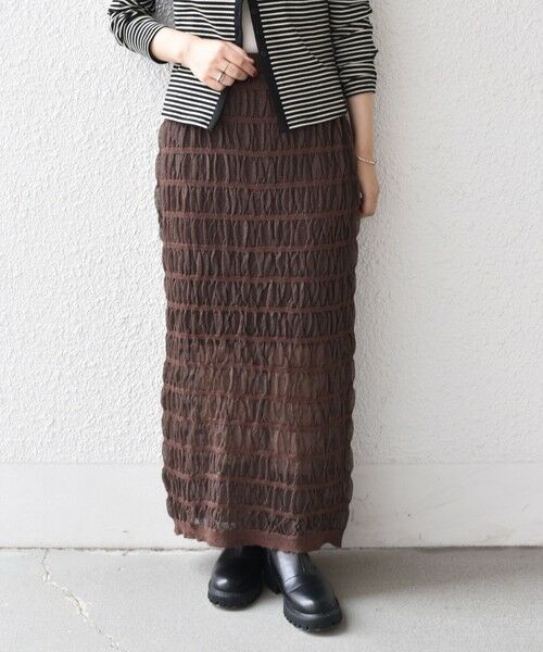 シャーリング素材が目をひくニットタイトスカート。