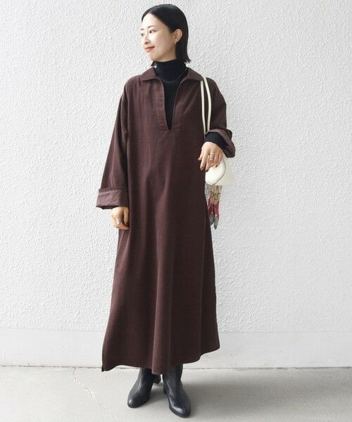 大人な抜け感のある深めのスキッパーデザインのワンピース。