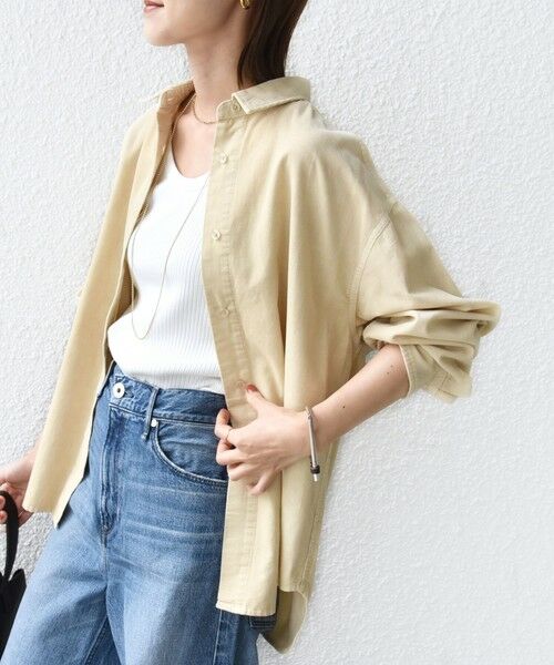 釦を真ん中まで外して、キャミソールやタンクトップを覗かせた抜け感ある着こなしがおすすめです。
