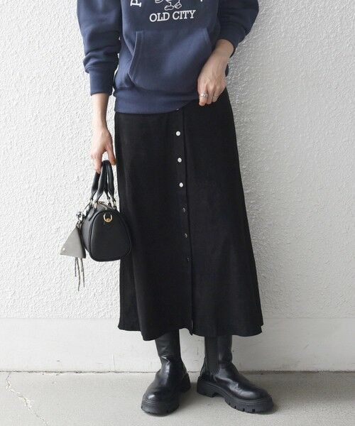 シーズンムードを高める、ポリエステルスエード素材のロングスカート。