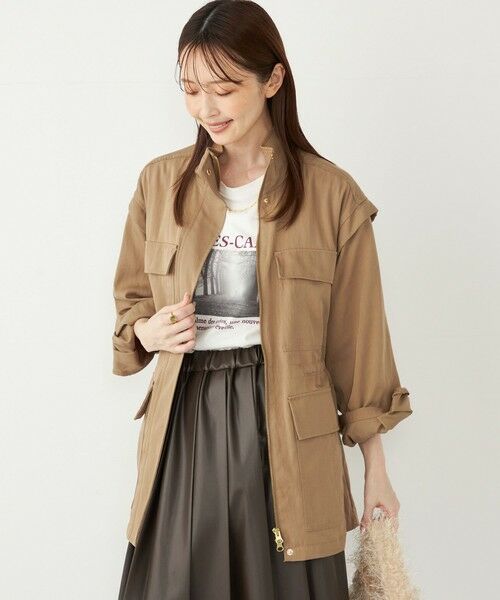 カジュアルなミリタリーデザインながら、やや光沢感のある素材で上品見えするブルゾン。