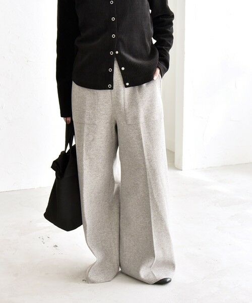 着心地:やや伸縮性のあるしっかりとした生地。脚のラインを拾わないワイドシルエットです。