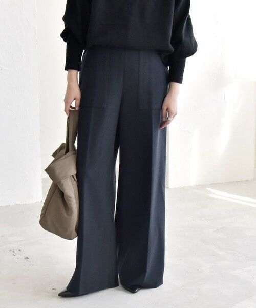 フロントの大きめのアウトポケットを配置した、ベイカーライクなデザインのワイドパンツ。