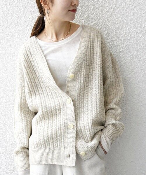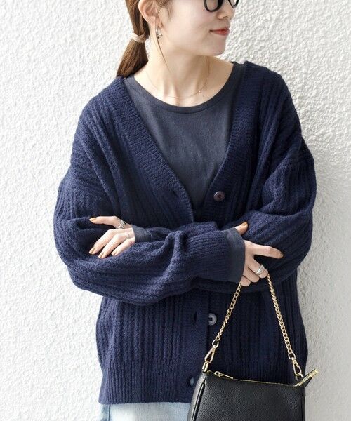 デザイン性のある柄編みがポイントのVネックニットカーディガン。