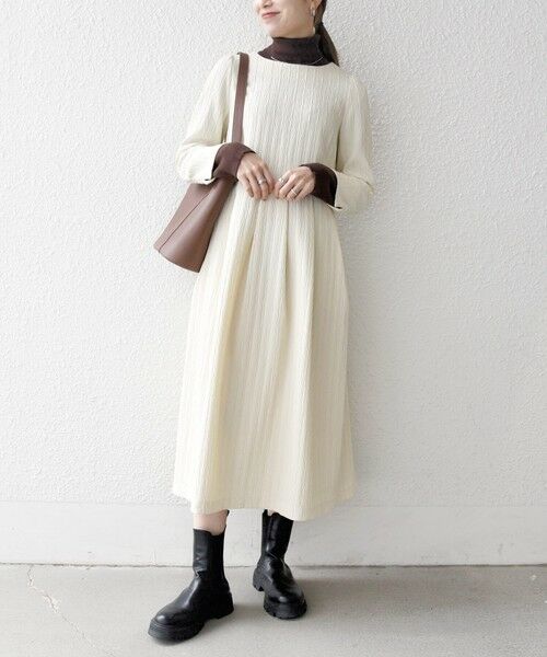 ふんわりと広がるフレアシルエットが女性らしい、クルーネックワンピース。