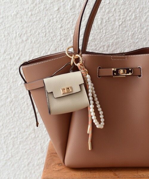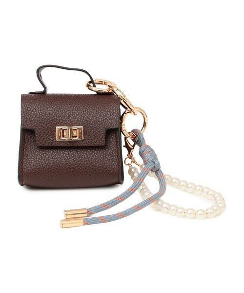 ミニバッグ型のチャームに、パールモチーフやコードモチーフを組み合わせ、異なるテイストをミックスさせたデザインです。