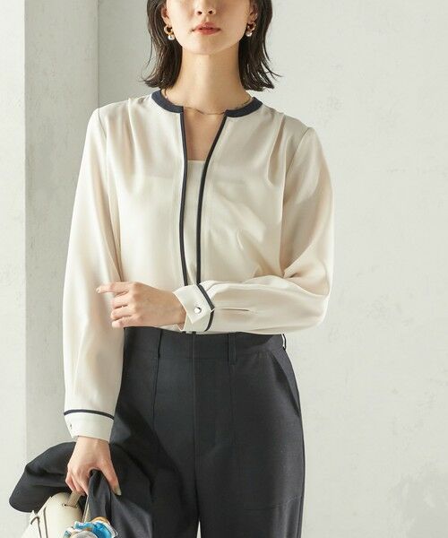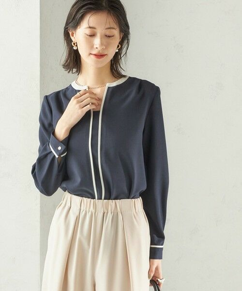 〈手洗い可能〉配色 パイピング キーネック 長袖ブラウス