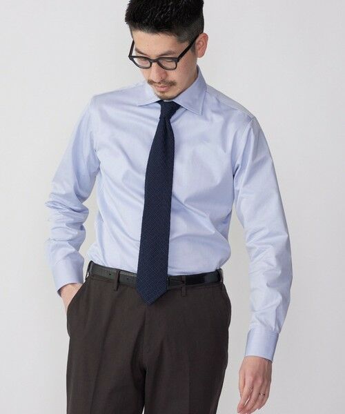 無地のライトブルーボディが印象を柔らかく新鮮に見せてくれますのでコンサバなネイビーやグレーのジャケットで合わせていただくのがおすすめです。