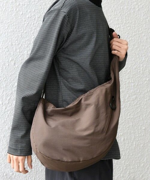 体のラインにしっくり馴染む三日月型のショルダーバックで、マチ部分には図形を組み合わせたSHIPS anyのロゴが刺繍されています。