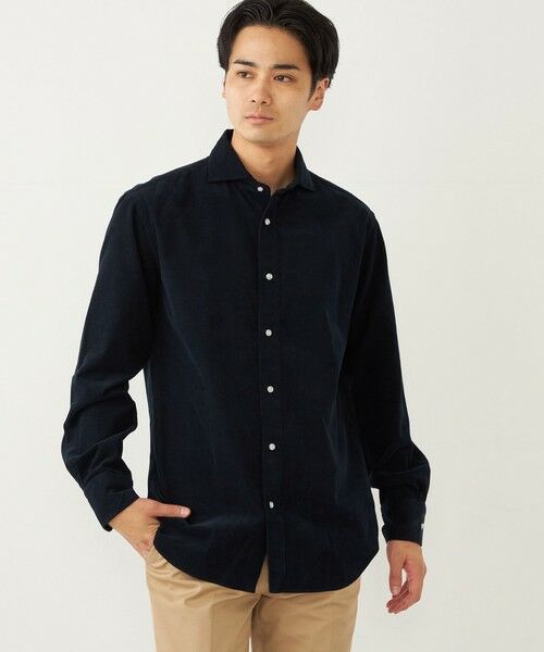 引き続き注目のコーデュロイ素材を使用した、ドレカジにピッタリなワイドカラーシャツ。