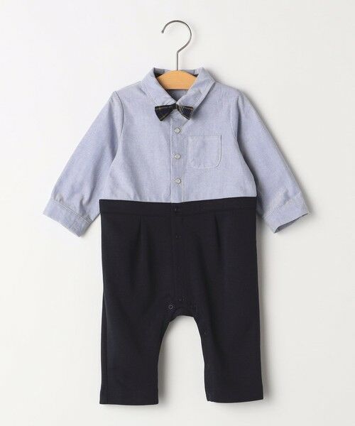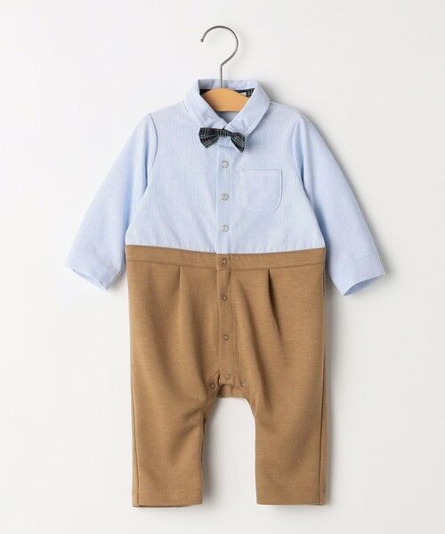 シャツ地のトップスとポンチ素材のボトムを組み合わせた、一枚でおしゃれに決まるコンビロンパースです。トップスは、爽やかなストライプ柄ときちんと感のある無地でご用意。ボトムにはストレッチ性のあるポンチ素材を使用し、元気なベビーも動きやすく快適な着心地に仕上げました。襟元の蝶ネクタイは、それぞれのカラーにマッチするチェック柄をチョイス◎スナップ釦で取り外しが可能なため、シーンに合わせてお使いいただけます。前開きデザインで簡単に着脱できるのもパパママには嬉しいポイント!ちょっとしたお出かけや、セレモニースタイルにもピッタリのアイテムです♪