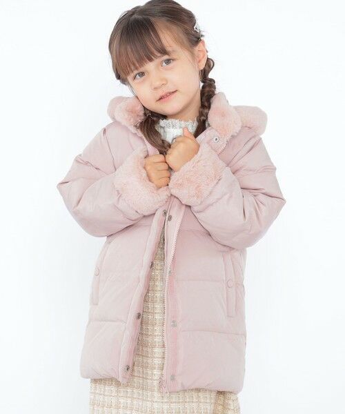 フードにあしらったフェイクファーやリバティプリントが可愛らしく、カジュアルになりがちなダウンもぐっと上品な印象に◎