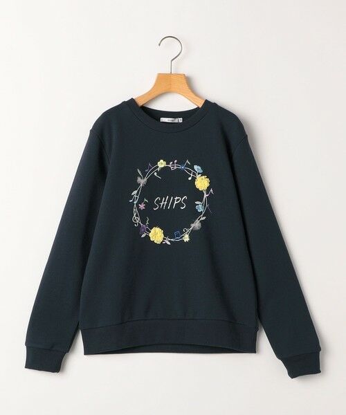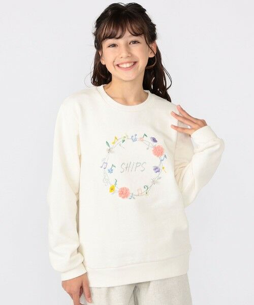 毎年大好評♪思わず心が弾むミュージックグラフィックのスウェットです。今シーズンは、華やかなお花のリースにカラフルな音符をあしらったキュートなデザインでお届け。たくさんの色糸を使用した鮮やかな刺繍に、お花とリボンを立体感のあるシフォンやチュールで見立てたアクセントの効いた遊び心溢れる一枚。「SHIPS」ロゴとリース部分を、キラキラしたグリッターで描いたのも女の子心をくすぐるポイントです!綿100%の裏毛素材を使用し、柔らかく快適な着心地◎程よい厚みでアウターも羽織りやすく、デイリーユースにもピッタリ。ボトムを選ばず着回しでき、一枚で着映えする主役級のアイテムです!