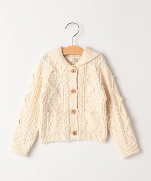 セーラーカラーがポイントのケーブルニットカーディガンです。身頃と袖は、ポップコーン編みが可愛らしい立体感のある表情豊かなデザインに仕上げました。肌が繊細なキッズにも嬉しい、やわらかく滑らかな肌触りで着心地も◎秋冬の雰囲気にマッチする、優しいストーンとピンクの2色展開でお届け。羽織としてはもちろん、釦を閉じてカーディガンが主役になる着こなしもお楽しみいただけます。前立ての木彫り釦と両脇の小さいパッチポケットもポイント♪ネットを使用し、ご自宅の洗濯機でも洗濯可能なため、デイリーユースにもおすすめの一着です。