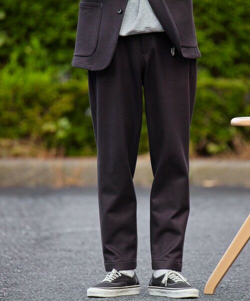 幅広いスタイリングに使用できる細身のシルエットに仕上げ、ウエストはゴム仕様でストレスのない履き心地です。