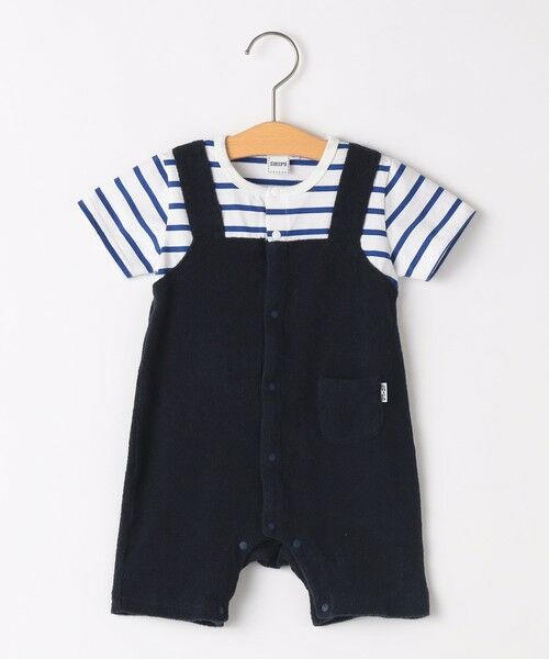 ボーダーの半袖TEEとオーバーオールを組み合わせたフェイクロンパース