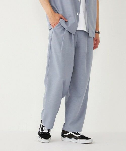 きれいめな表情を持つポリエステルトロ素材を使用した、ややワイドなシルエットのテーパードパンツ。
