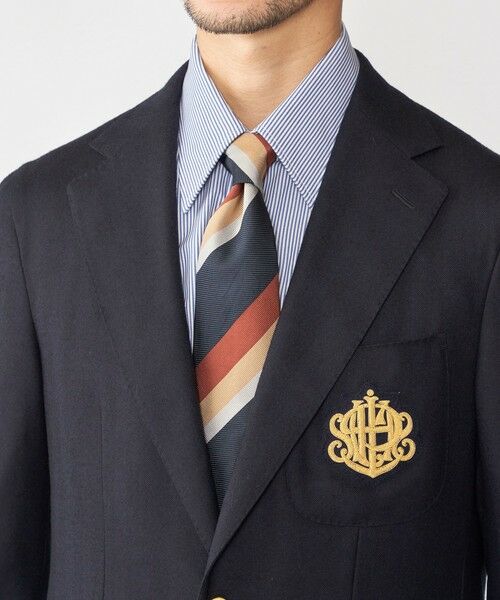 鮮やかなカラーを使用したモダンなレジメンタル柄がVゾーンを華やかに彩ります。