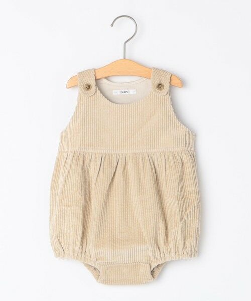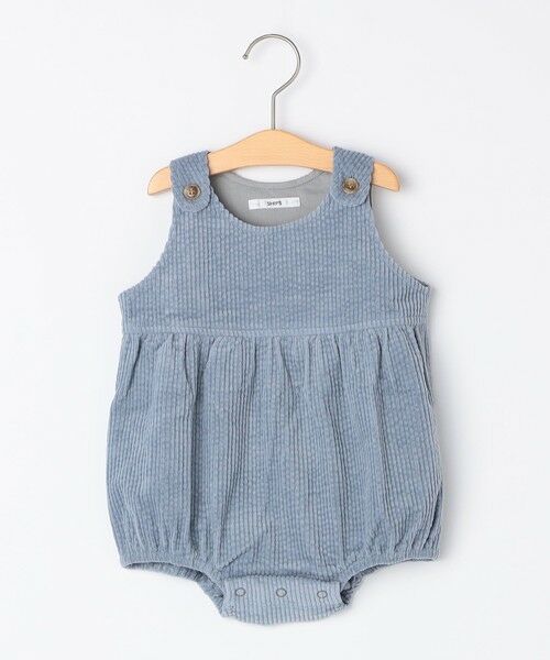 柔らかなコーデュロイを使用した、オーバーオール型のロンパース。