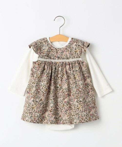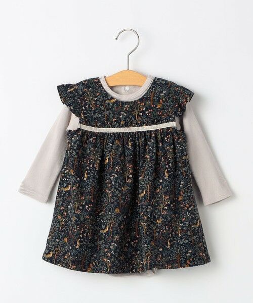 可愛らしい小さな動物や木の実がプリントされたコーデュロイ素材のジャンパースカートと適度なフィット感のロンパース。