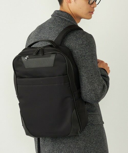 表地に撥水加工を施したポリエステル、デザインディテールに牛革を使用したバックパック。
