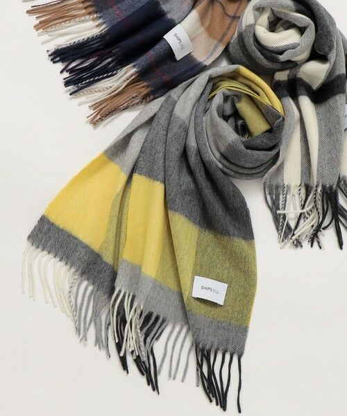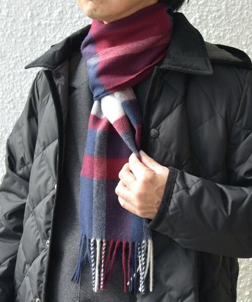 鮮やかなチェック柄が映える、カシミヤ混のマフラー。