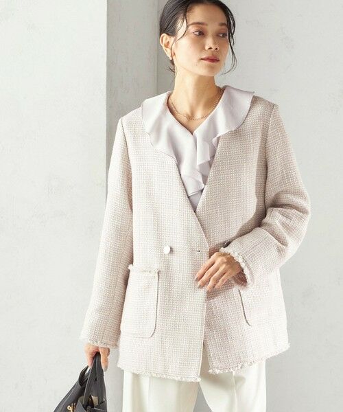 カラーレスで首元がすっきり見えるツイードジャケット。