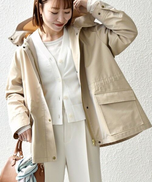 顔まわりをすっきり見せてくれる大きめフードに、ヒップまで隠れる丈感で、気になる部分をカバーしつつ女性らしく着こなせます。