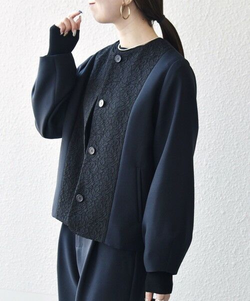 フロントのレース切替が品よく華やぐ、ノーカラージャケット。