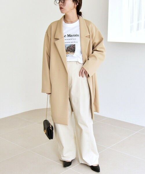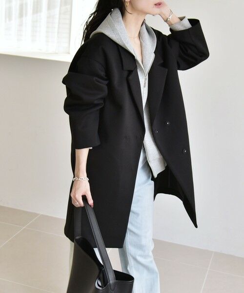 長めの着丈と直線的なシルエットが縦のラインを強調し、すっきりとしたスタイルに。