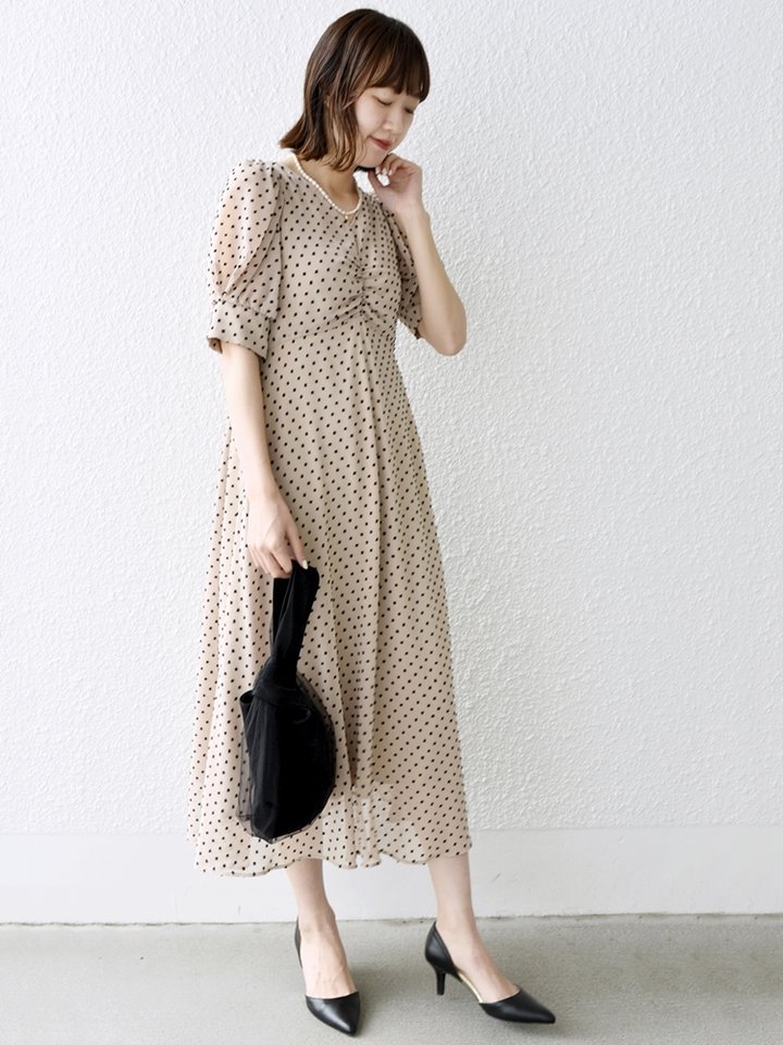 胸元のギャザーやふんわりとした袖デザインが女性らしさたっぷり セレモニースタイルにもぴったりなドットワンピース