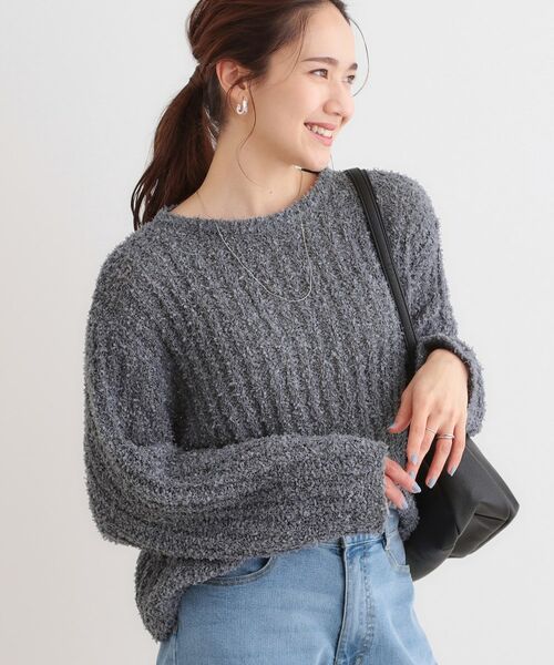 リボンのようなテープ状の糸をミックスした、表情豊かな糸で、緩く、軽く上がるよう編みたてています。