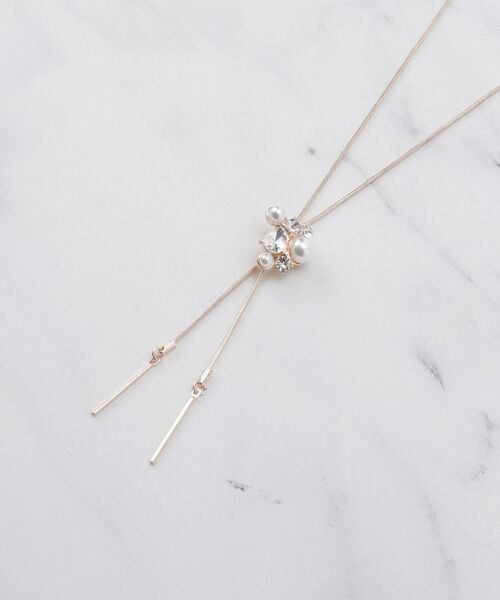 エレガントなフェイクパールとキラキラ輝くビジューを組み合わせたループタイネックレス。