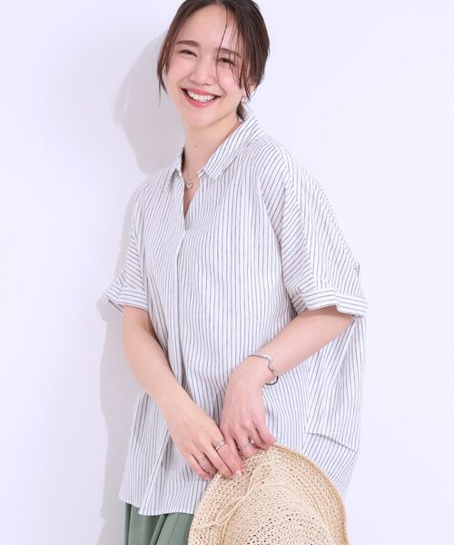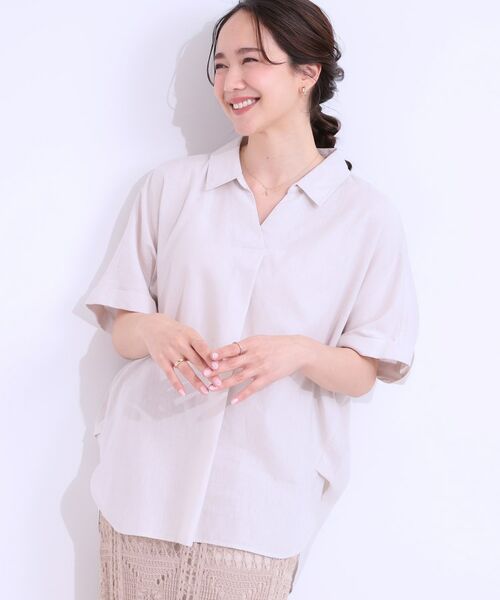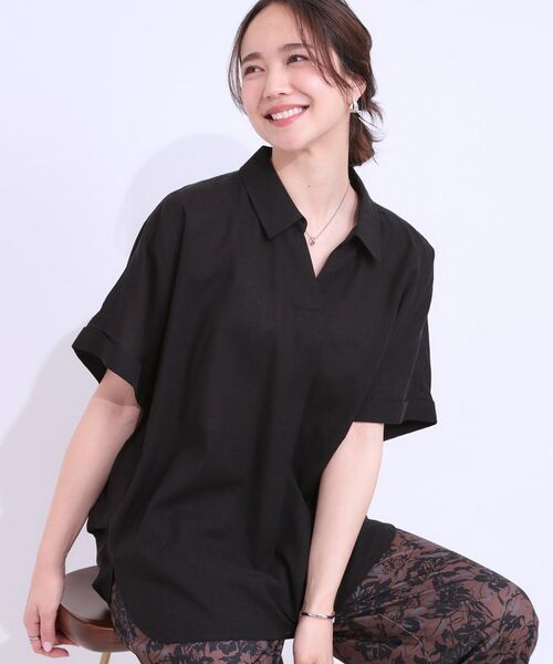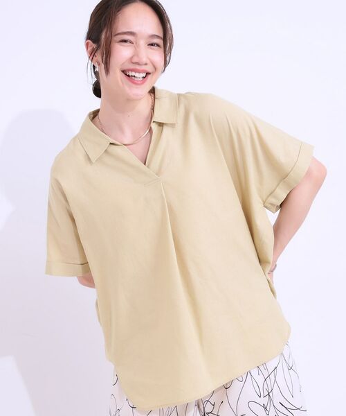 襟付きのスキッパーデザインで首元がすっきり見え、