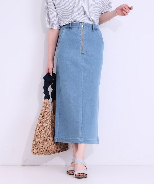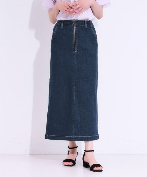 ジップがアクセントのデニムナロースカートです。