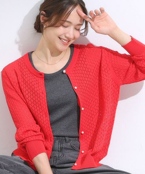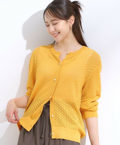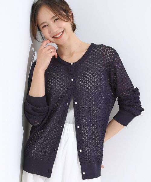透かし編みとマルチボタンが目を惹くデザインニットカーディガンです。