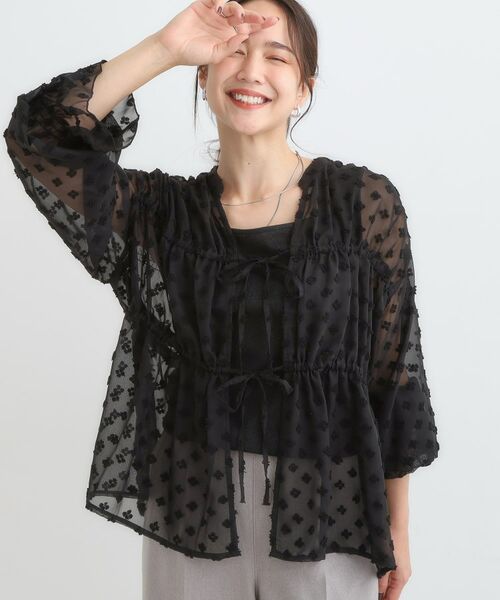 花柄のような表面感に、特徴のあるシアードビー素材を使ったリボンブラウスです。