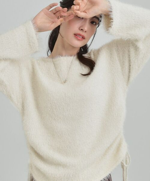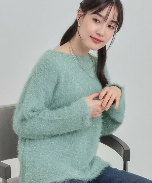 ラメ入りフェザー調の糸を使用した1枚で着映えるニット。