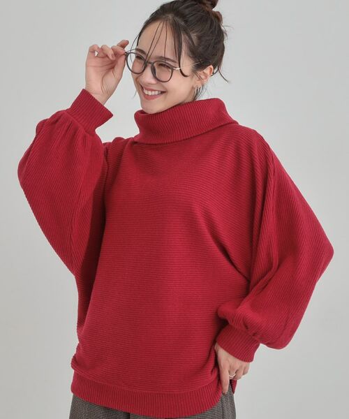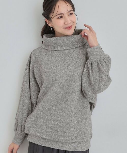 リブの凹凸感とゆったりとしたオフタートルなので、首回りがスッキリと見える印象に。