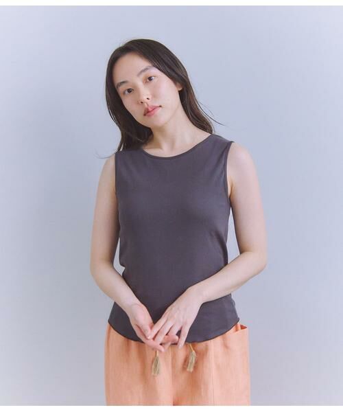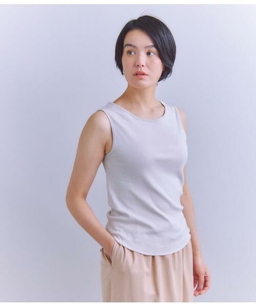 クルーネックのタンクトップ。肩ひもなどが響かない様に、敢えて肩線を広くとっています。裾はロックミシンなどに用いられるウーリー糸で、メロー始末にすることでフラットな印象に仕上げました。