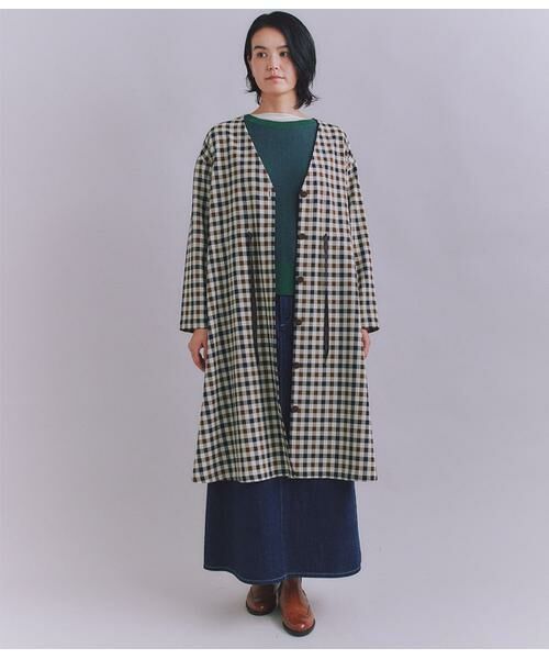 フィラメントポリエステルを使用し、ウールのようなナチュラルな風合いを残した、先染めのブロックチェック生地。表面には織りの畝がほどよいアクセントを添え、やや大きめのブロックチェックが目を惹き、ほどよい存在感がありながらも、落ち着いたトーンで日常に取り入れやすい柄感に仕上がっています。