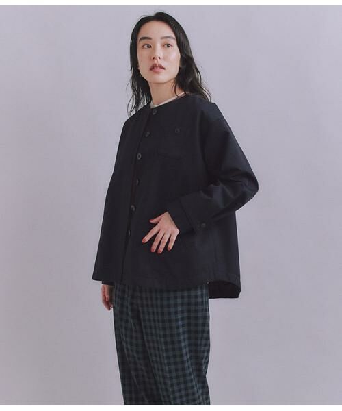 下3つの釦を比翼にした、ヘンリーネックのような前立てが印象的なハーフコート。裾はシャツテール仕様で、動いたときにふわりと広がるシルエットに。広めの裾幅ですが、サイドをりラウンドさせることで、落ち着きのあるハリ感を持たせました。袖口にはストームタブを付けており、フィット感の調整が可能です。胸ポケットには、今シーズンのテーマカラーをアクセントとして、配色のカンヌキ留めを施しました。ポケットあり。裏地あり。