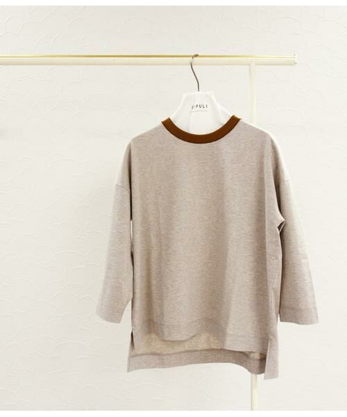 7分袖のクルーネックプルオーバー。ゆったりシルエットのルーズな着心地ながら、肩のドロップは程よく抑え、カジュアルになりすぎないバランスに仕上げています。襟ぐりは同じ糸でフライス切り替えを施し、接ぎ目には特殊ミシンによるルーズロックで手縫いのような表情をプラスしました。バックプリントには、シプリのKeittoグループのカットソーにも使用しているネームをプリント。レシートを模した遊び心あるデザインで、四か国語で「サンキュー&グッバイ」が記載されています。