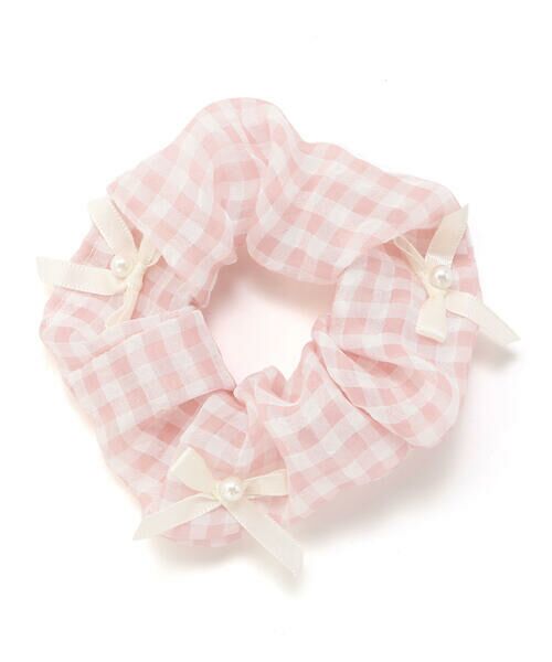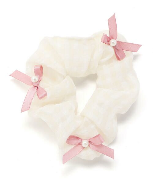 オフホワイト系・ピンク系:透け感のあるチェック生地にポンポンと並んだリボン+パール風ビーズがフェミニン