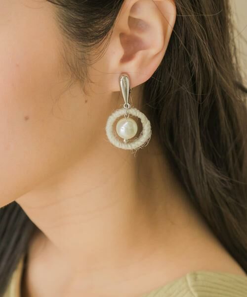 ジュートのような毛羽立ちのある糸を巻き付けたサークルモチーフに一粒パールを施したイヤリング。