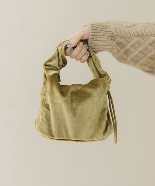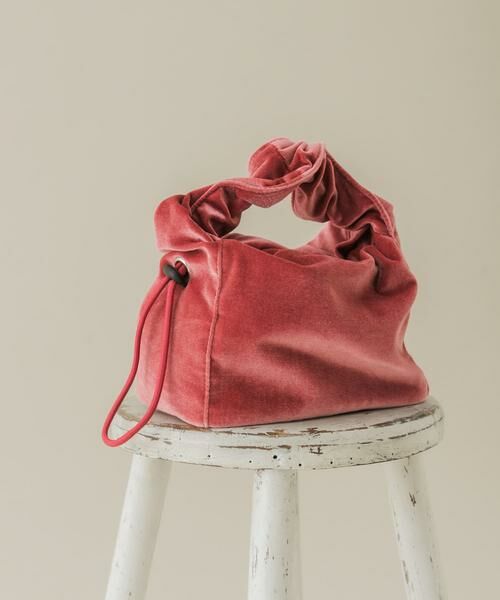 滑らかで微光沢の生地感が特徴のベロア素材で仕立てたハンドバッグ。