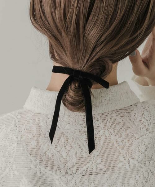 結婚式のお呼ばれや会食、卒業式などのセレモニーシーンにもマッチする上品なベロア生地で仕立てたリボンのヘアポニー。